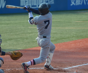 対東京大学一回戦は、1点を追う4回表、山本泰寛(環2)の3点本塁打で逆転します。その後も7回表の北村(商2)の2点適時打、8回表の谷田(商2)の走者一掃の適時三塁打などで8点を追加します。投げては、先発の白村(商4)が相手打線を抑えて完投し、11‐2で勝利しました。