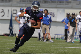 ▲WR#16 坂本健(政3) この試合1得点目となる25ヤードの パスをキャッチし、タッチダウンを獲得。 |