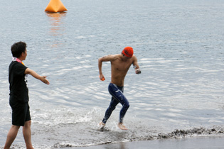 この試合は岩海岸海水浴場にブイを設置し、コースを作って泳ぐという形式のものです。個人3kmの部では、複数設置されたブイを順々に辿りながら泳ぐことで3kmになるコース設定になっています。