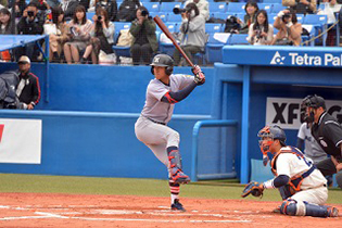対法大二回戦は、初回、適時二塁打や本塁打で4点を先制されます。追いつきたい打線は4回表、嶋田の本塁打で1点を返しますが、その裏、本塁打を浴び再び4点差とされます。それでも5回表、二死から柳町が四球を選ぶと、代打・鶴岡(環3)の適時二塁打で1点を返します。さらに7回表、先頭の瀬戸西が右前安打で出塁すると、水久保(総3)が四球を選ぶなど二死二三塁の好機を作り、中村の適時二塁打で2点を奪い、1点差に詰め寄ります。しかし、その後を無安打に抑えられるなど反撃及ばず、4-5で敗戦致しました。
