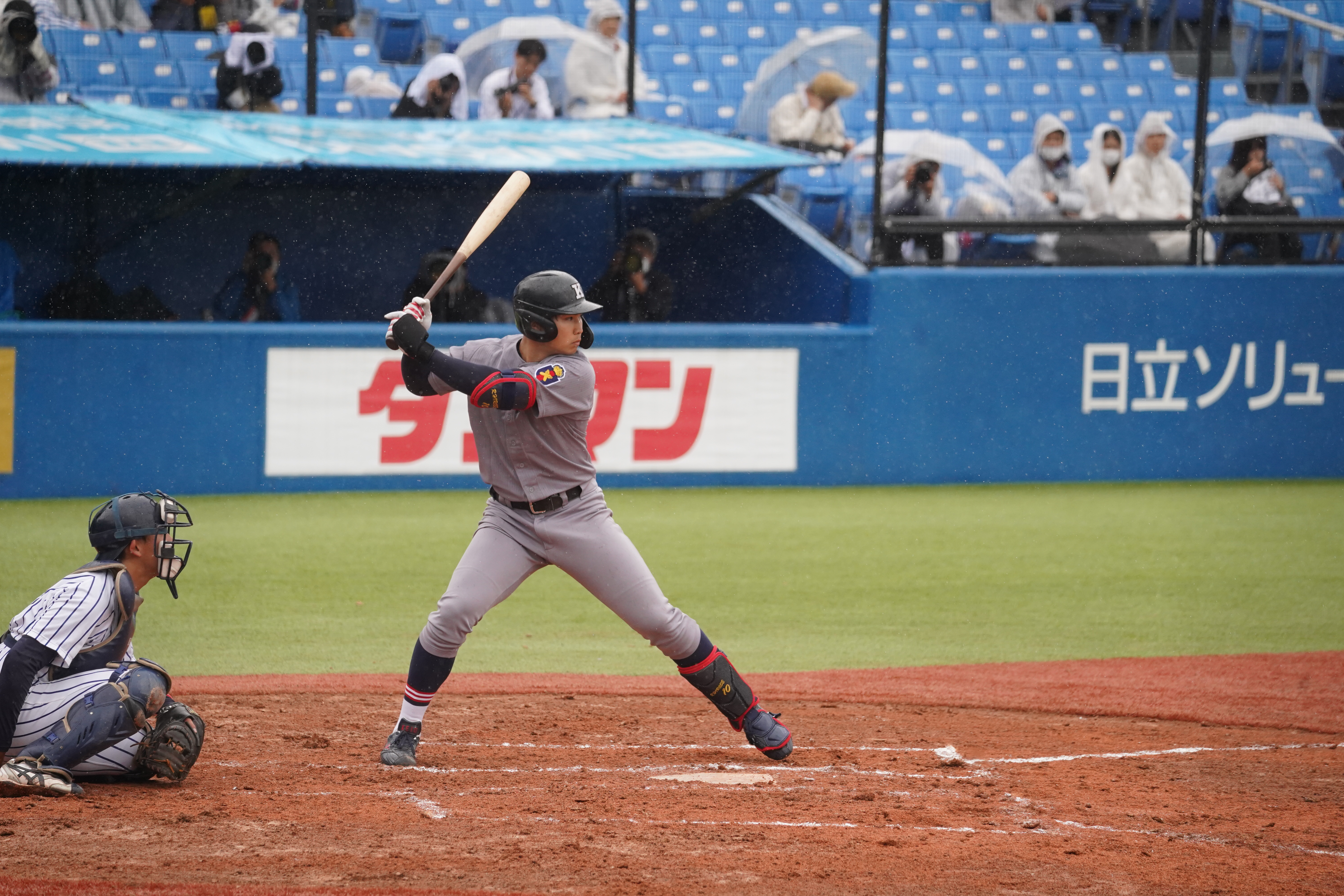 対立大一回戦は、1回表、廣瀬(商4)が今季4号目となるライトへの本塁打を放ち、幸先よく1点を先制します。4回表、栗林泰(環4)、齋藤來(環4)の連打などで二死二三塁の好機を作ると、斎藤快(商3)の適時打で1点を追加します。しかしその裏、先頭の二塁打などで一死二塁とされると、続く打者に適時二塁打を浴び、1点を返されます。これ以上追加点を与えたくない投手陣でしたが5回裏、中前安打、死球などで二死満塁とされると、左翼手の頭上を大きく超える適時二塁打で2点を失い、逆転を許します。何としても反撃したい打線は9回表、栗林泰のライト線への二塁打で得点圏に走者を置くと、続く齋藤來に適時打が飛び出し、同点に追いつきます。失点できないその裏、中前安打、2つの四球などで二死満塁の窮地を招くも、この回からマウンドに立った谷村(環4)が後を二ゴロに打ち取り、3-3で引き分けました。