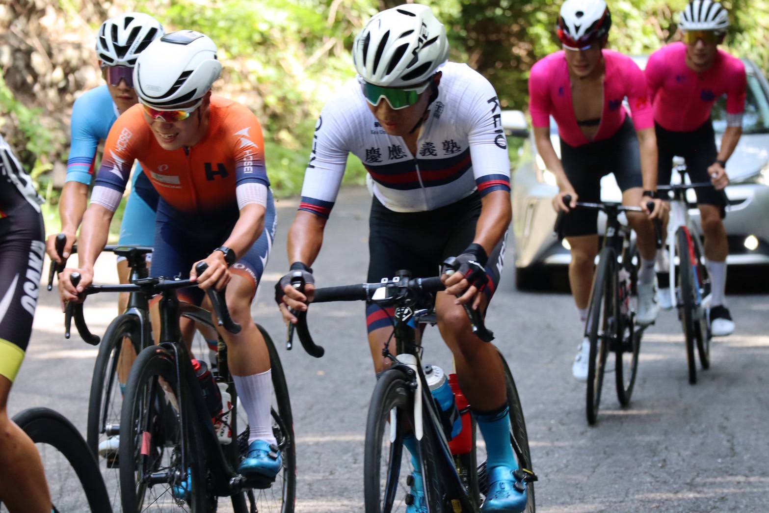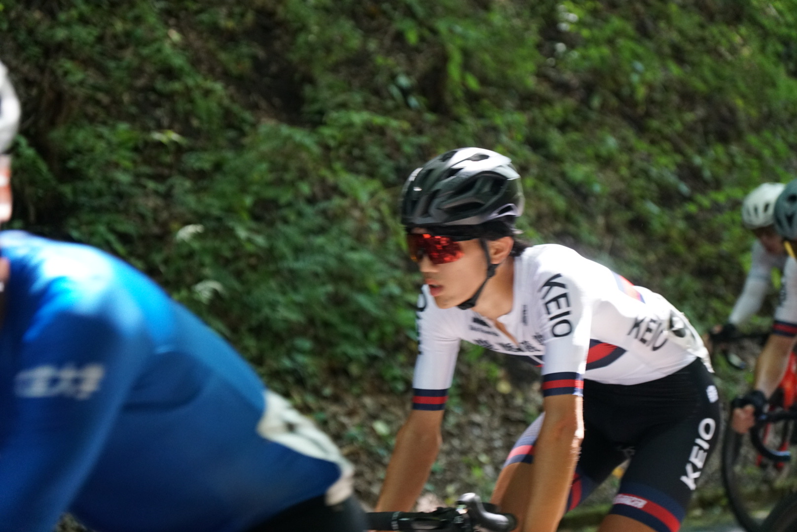 | レース中盤の登り区間、集団内に上手く位置取り走行する吉村紘太朗(理1) |