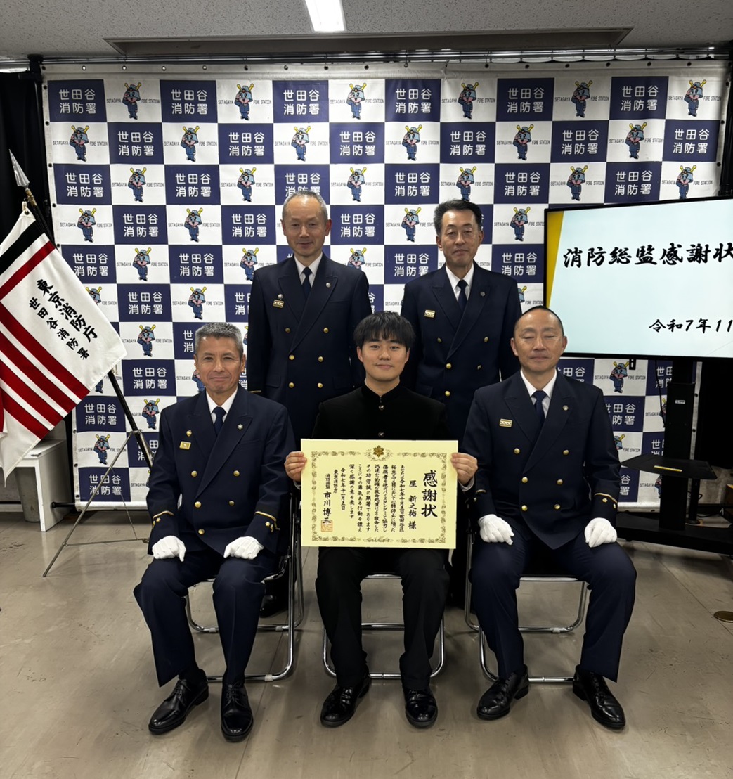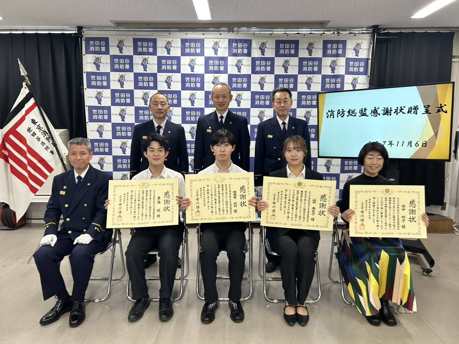 この救助活動に対して、世田谷消防署から表彰されることとなり、11月5日(水)に屋君、6日(木)に東海君と横須賀君が表彰式に出席、感謝状が授与されました。